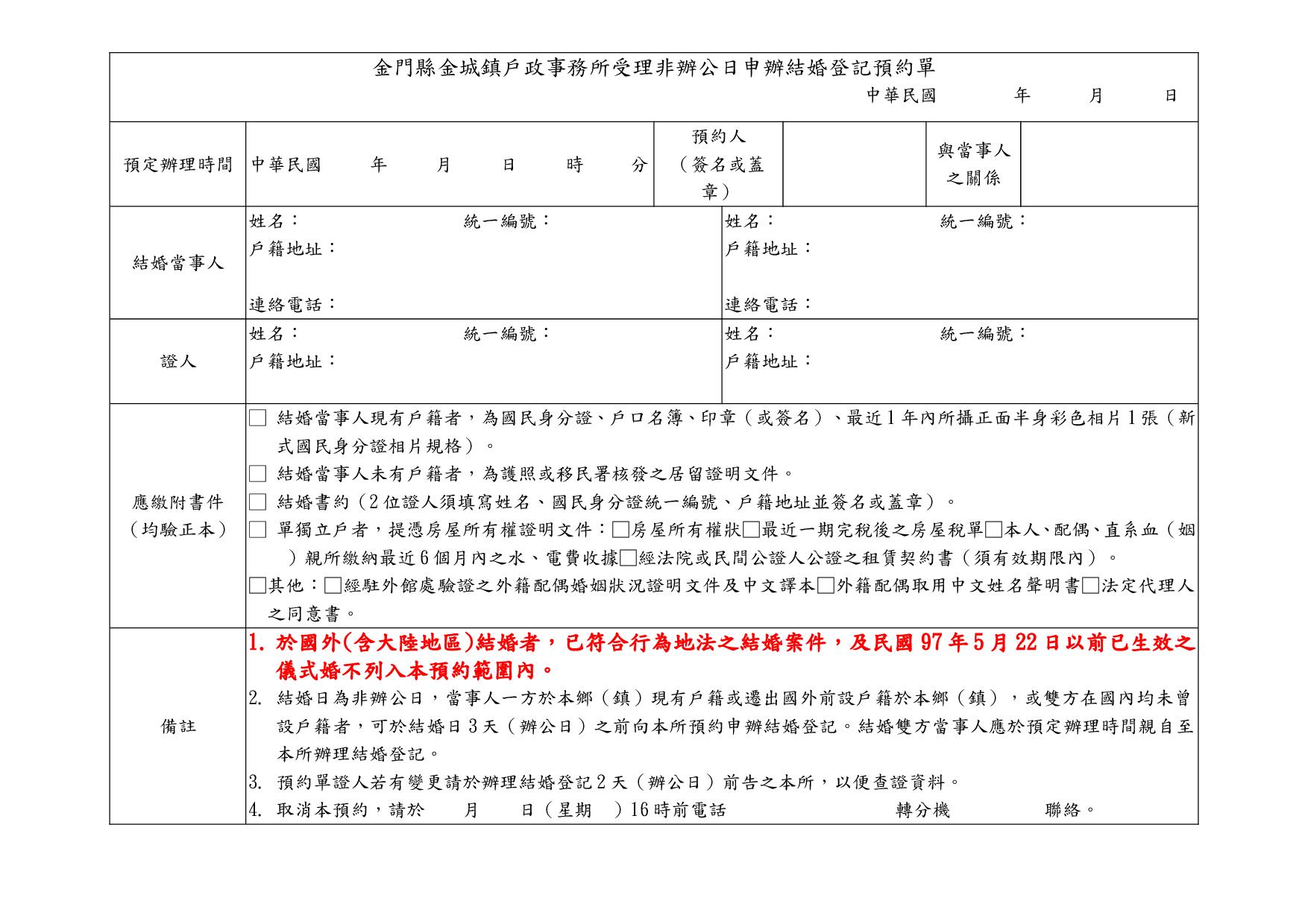 預約申請書:假日結婚登記預約單(附件) ★預約假日結婚登記,僅限當日結婚登記生效,不能指定平日為結婚登記生效日。